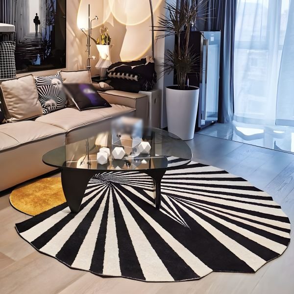 Thanks to its monochrome palette and irregular outline, this carpet fits effortlessly into a wide range of interior styles—be it modern minimalism, urban chic, or eclectic bohemian. The bold stripes can elongate your space, while the irregular edges add an organic, free-flowing feel. Pair it with sleek metal furniture for a high-contrast look or soften it with warm wood tones for a cozy yet sophisticated vibe.